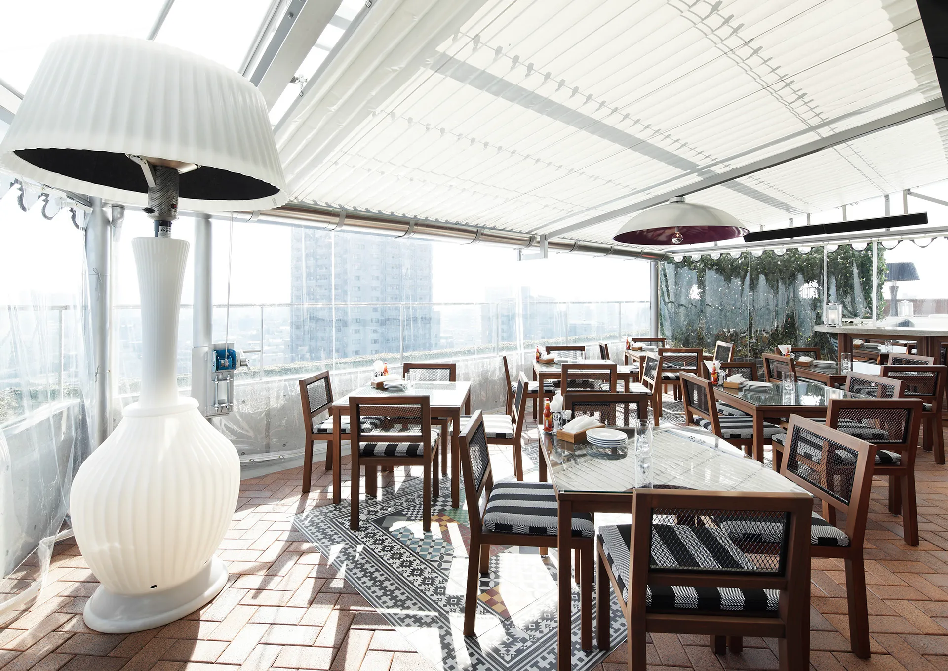 At the outdoor terrace with a breathtaking view overlooking the city of Tokyo,