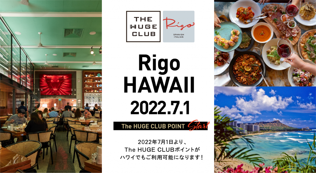 サービス提供開始から1年を記念し、ついに7月1日よりグループ会社のHUGE HOSPITALITY UNIVERSAL GROUP INC.が運営するハワイ・オアフ島の「Rigo SPANISH ITALIAN」でも「The HUGE CLUB」がご利用が可能になります。
