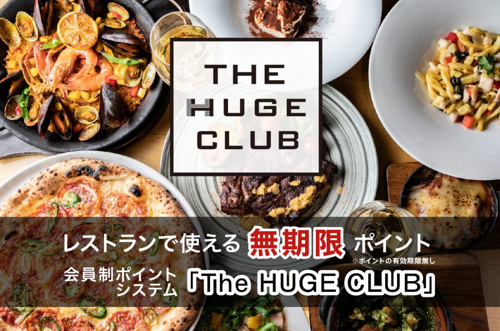 HUGEが運営するDAZZLE(ダズル)やRIGOLETTO(リゴレット)、Hacienda del cielo(アシエンダ デル シエロ)など国内29のレストランをThe HUGE CLUBよりご予約頂くと、ご飲食代の5%(ランチタイムは2%)をポイントバックする会員制ポイントシステムです。このポイントは、次回以降店舗利用時に 1ポイント=1円 としてご利用いただける、有効期限無しの「無期限ポイント」です。