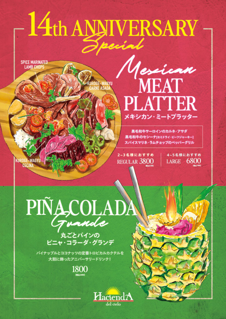 代官山のメキシカンレストラン「Hacienda del cielo」が14周年を迎えます。2025年2月3日(月)〜9日(日)まで数量限定で14周年特別メニューをご提供いたします!