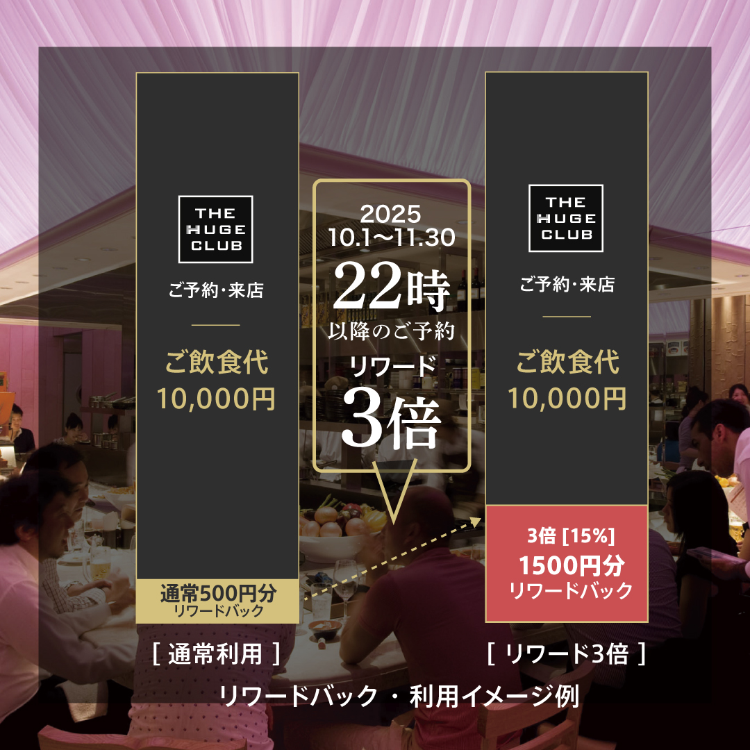 RIGOLETTO KITCHENの深夜営業が再開を記念して、10月1日〜11月末までの期間限定で、公式予約サイト「The HUGE CLUB」から22:00以降の時間帯をご予約いただいたお客様には、通常の3倍のリワードを付与いたします。