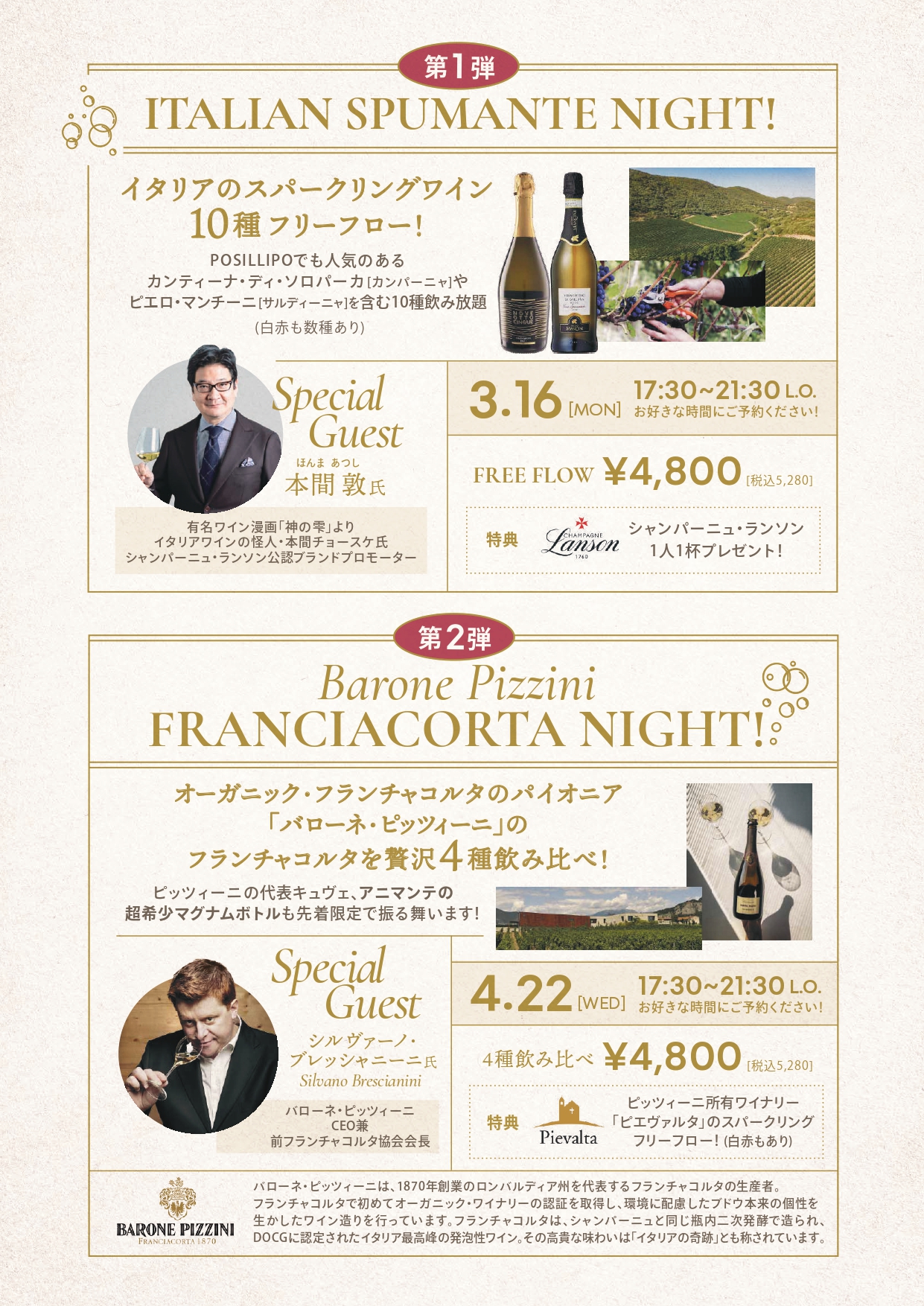 第2弾 4月22日(水) Barone Pizzini FRANCIACORTA NIGHT!