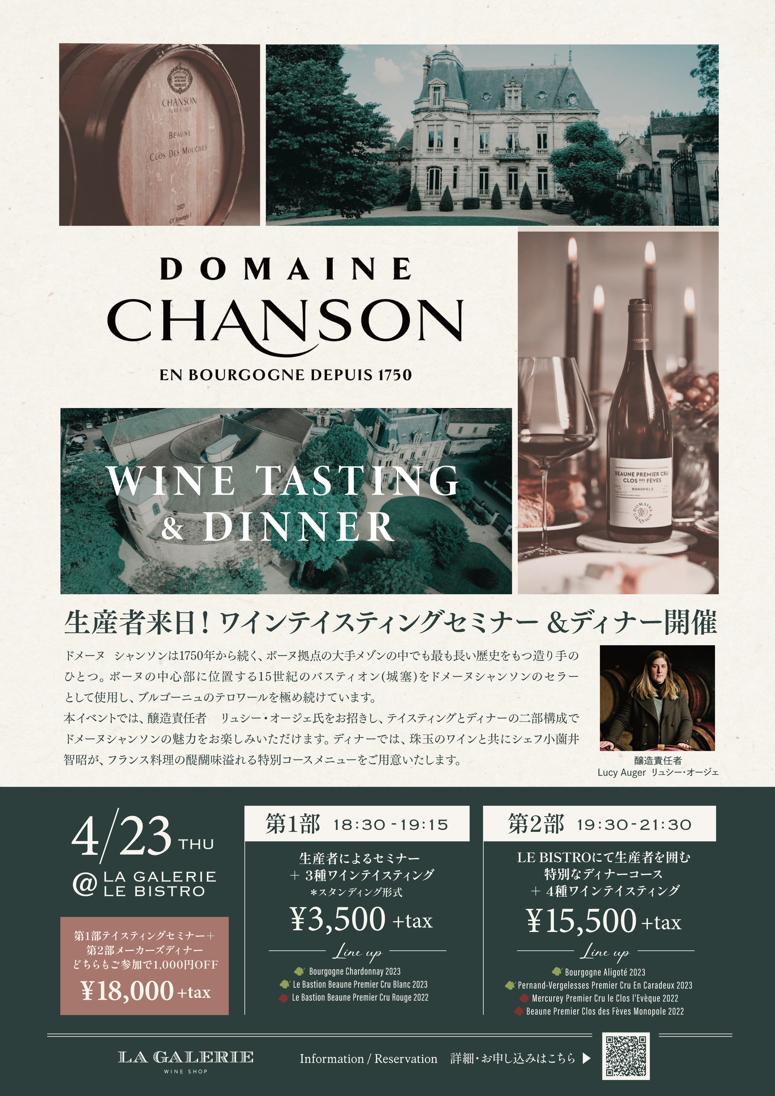【LA GALERIE / 北参道】ブルゴーニュ好きの方へ。ボーヌを代表する歴史的ドメーヌDOMAINE CHANSONによるワインテイスティングセミナー&ディナーを開催!