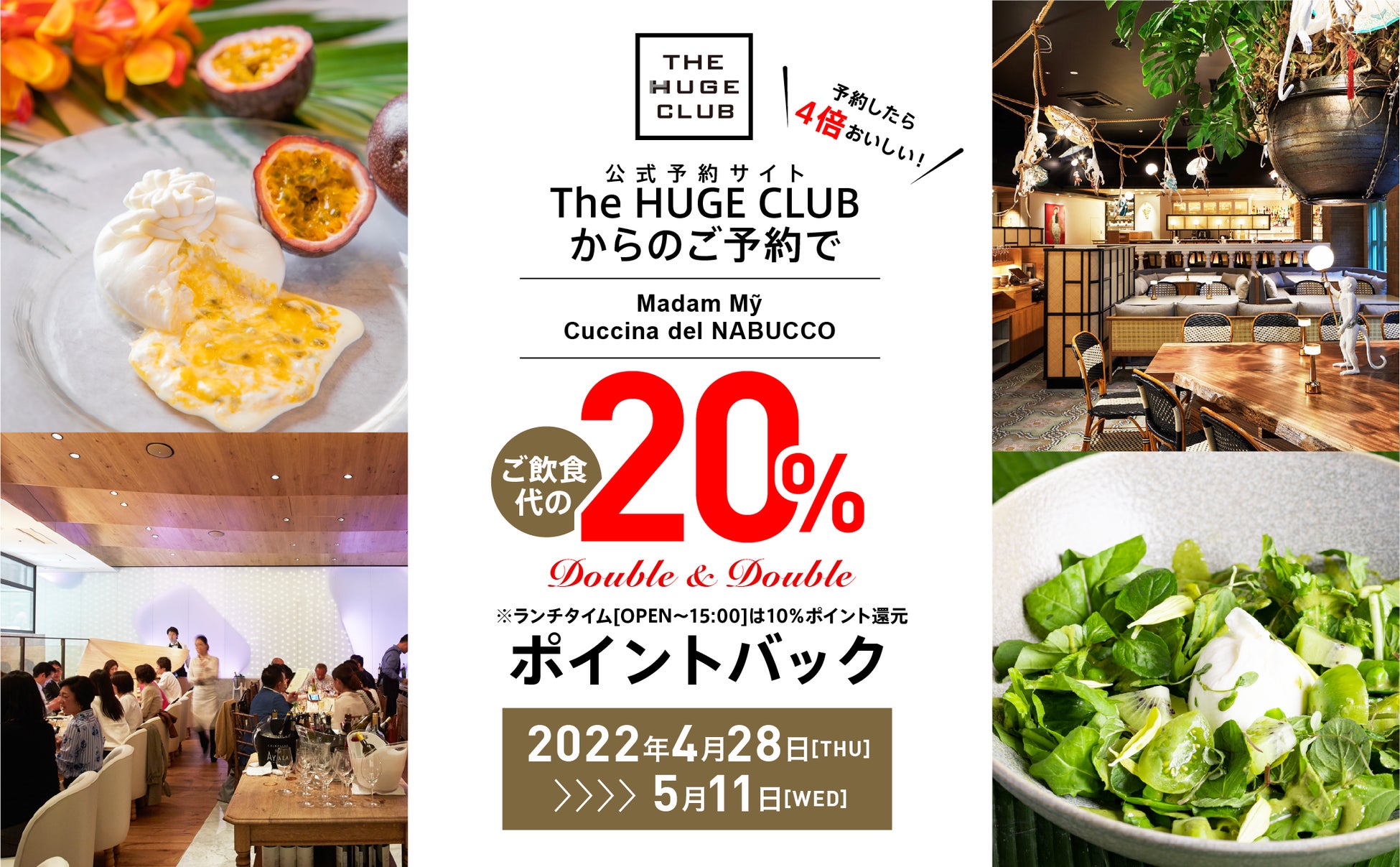 GW特別企画!予約すると4倍おいしい、ポイントが貯まる公式予約サイト【The HUGE CLUB】ポイントアップキャンペーン/cucina del NABUCCO・Madam Mỹ modern thai Vietnamese