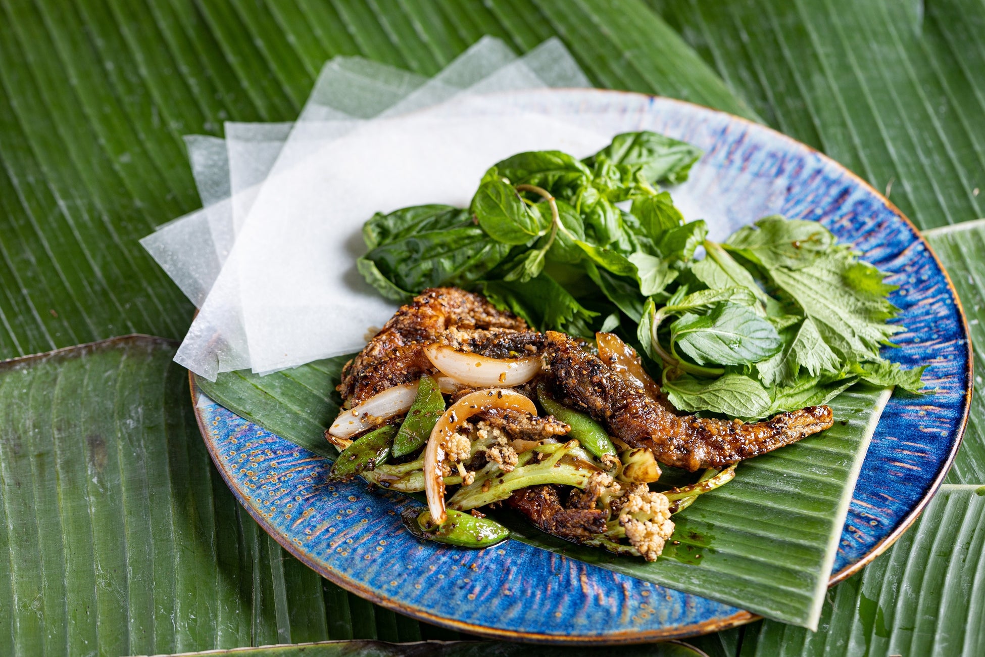 ソフトシェルシュリンプを一度素揚げし、旨味をとじ込めたあと、新玉ねぎ、マーメラスなどの春野菜と黒胡椒で炒め、スパイシーに味付け。たっぷりのハーブと一緒にライスペーパーに包んでいただく「ハノイスタイル」。ソフトシェルシュリンプとハーブのしっとりとした一体感を、一口に味わっていただけます。海老の噛みしめるほどに増す甘みと、ハーブの爽やかさ、黒胡椒のピリッとした辛みが融合する上品な味わいの一品です。