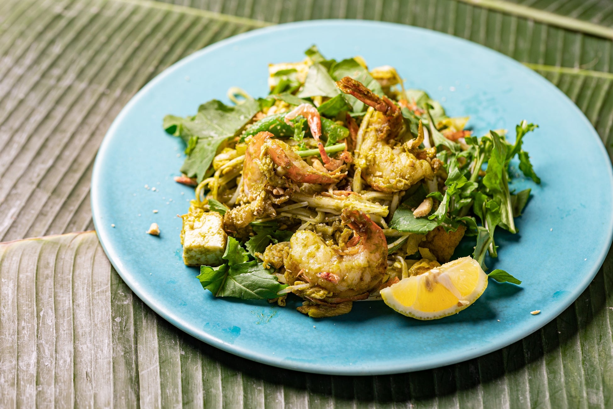 今回は、この鬼手長海老をパクチー・バジル・レモングラスのグリーンソースを使ったパッタイに。レモングラスの清涼感のある香りが突き抜ける爽やかさ。バジルのコクのある味わいと、パクチー特有の風味が見事に麺と海老に絡みます。