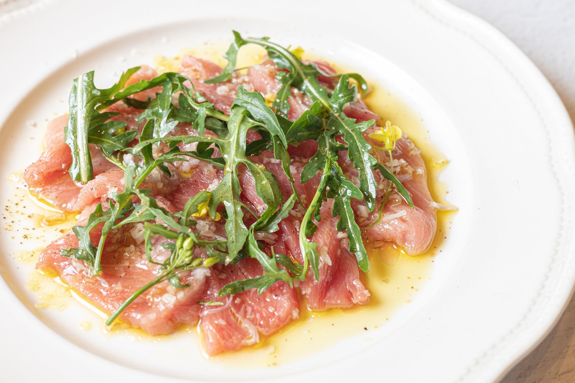 巷ではなかなかお目にかかることが少ない高級食材、天然本鮪を、こだわりの野菜と調味料でカルパッチョに仕立てました。