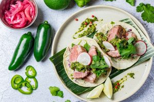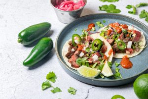 ミディアムレアのイチボは食べやすいように、コンカッセ(小さいサイコロ切り)にして、フレッシュハラペーニョやマイクロリーフのトッピング、チポトレチェリーサルサと一緒にお召し上がりください。どこを食べても、お肉、トッピング、サルサがバランスよく味わえます。イチボ肉のカリッとした表面と赤身の味の変化もお楽しみいただけます。