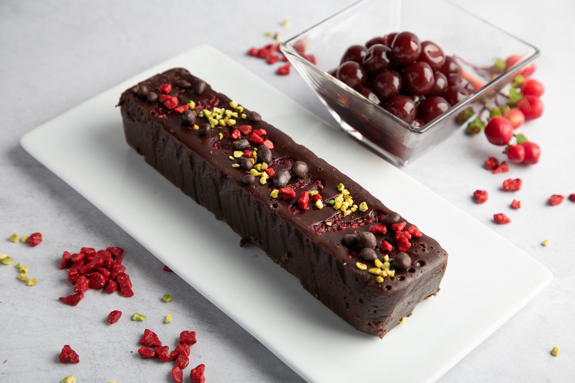 旨味がギュッと詰まったフリーズドライストロベリー、CHOCOLATE BANKのほろ苦いニブチョコ、クラッシュしたピスタチオをトッピングし、食感のアクセントに。ピスタチオのナッティな甘みと、グリオットチェリーの甘酸っぱさのハーモニーも様々に表情を変えながら、テリーヌに交わっていきます。