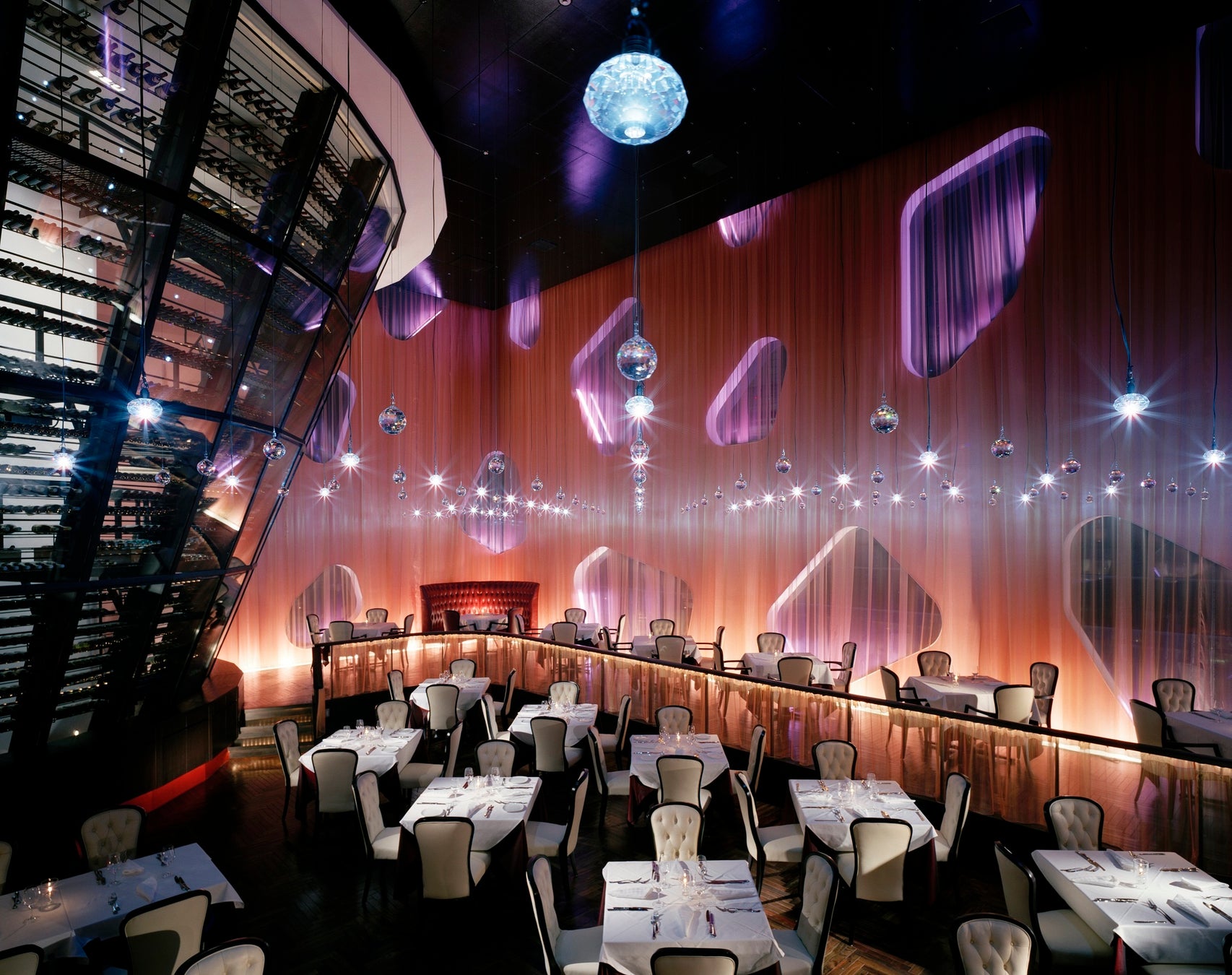 解放感あふれる天井高9メートルのフロアは、国内最大級のワインセラーとスワロフスキーの装飾が相まって光り輝く宝石箱のような空間が広がります。