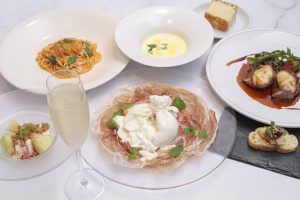 昨夏大人気の「とろける白桃ブッラータ」が今年も登場!ディナーに加えて、ランチからも楽しめるコースがスタート!みずみずしく柔らかい白桃とミルキーなチーズの組合せを贅沢に味わって。