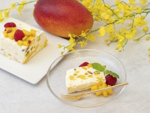 マンゴー、ドライマンゴー、リコッタチーズ、フロマージュブラン、生クリーム、ラズベリー、ピスタチオ、砂糖、はちみつ、卵、ゼラチン