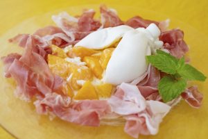 チーズの下には、薄くふんわりスライスした18ヶ月熟成させたパルマ産のプロシュートをで敷き詰めてご用意します。