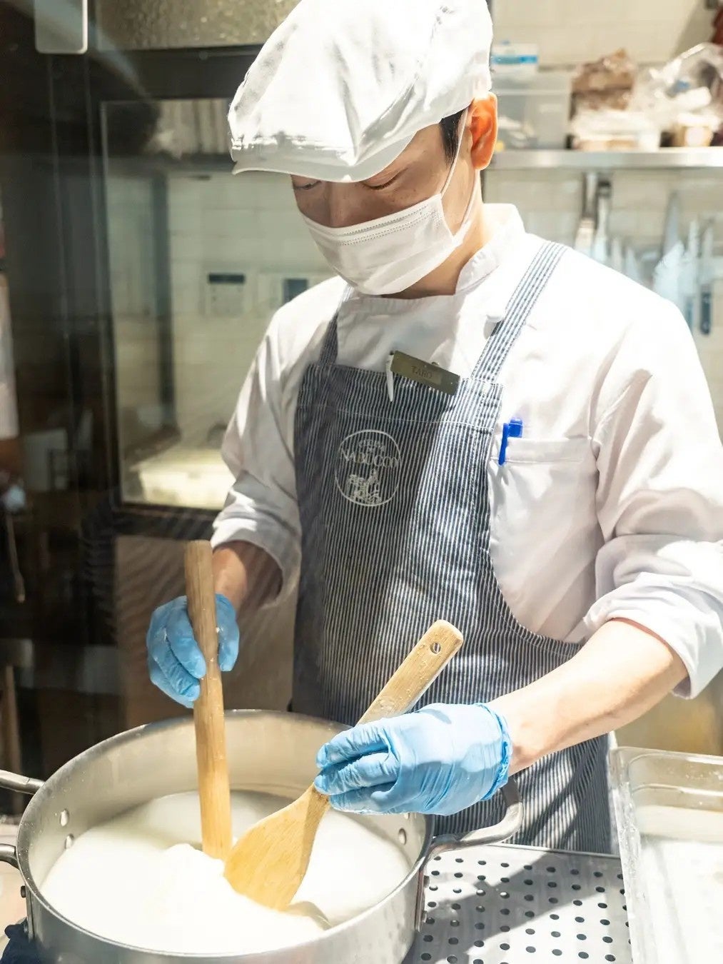 岐阜は飛騨の豊かな自然の中で育った飛騨牛の新鮮な生乳を使用。おいしいチーズを作るために、日々、生乳の鮮度、温度管理を徹底し、“なるべく触らず、やさしく”扱い、チーズのなめらかな味わいを追求しています。これがcucina del NABUCCOのチーズ作りのこだわりです。