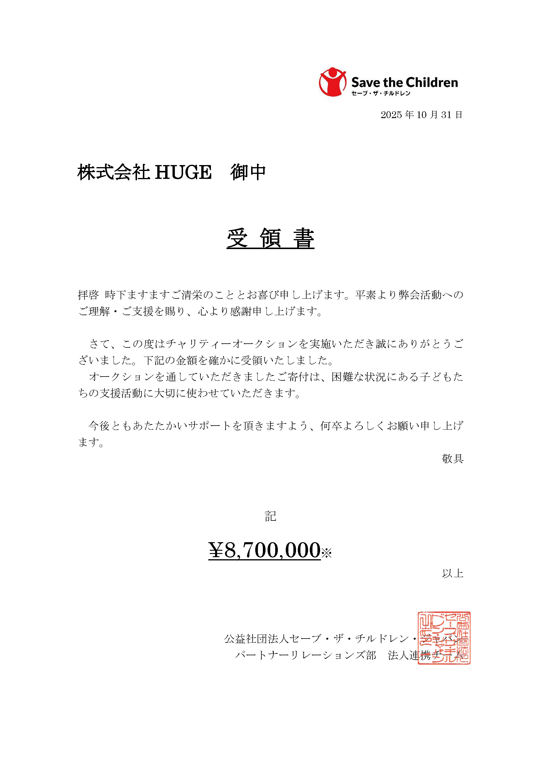 本オークションには、多くの皆さまにご参加・ご支援をいただき、落札金総額8,700,000円が集まりました。この寄付金は、落札者の皆さまからのご厚意により、当社が一時的にお預かりしたのち、全額を寄付させていただきましたことをご報告いたします。