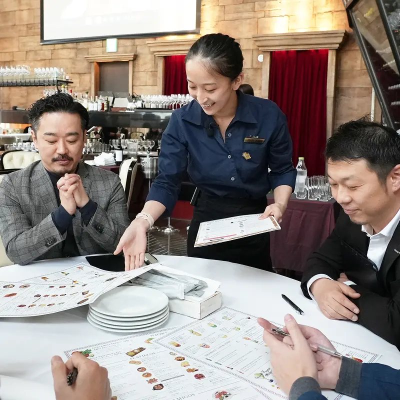 当社では、サービス、料理、バーテンダーの3部門において毎年社内コンテストを実施し、各分野のスペシャリスト育成に取り組んでいます。日々の業務に加え、スタッフが目標を持ってスキルを磨く機会を提供することで、現場力の強化とモチベーションの向上を図っています。こうした人材育成は、スタッフの長期的なキャリア形成と働きがいの創出につながると同時に、企業としての持続可能な成長にも寄与します。お客様に最高の体験をお届けするために、私たちは「人」を何より大切に育てています。
