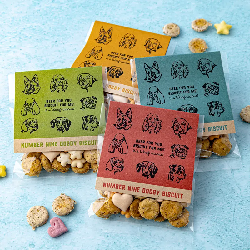 NUMBER NINE BREWERYでは、ビール醸造後に残る“スペントグレイン(麦芽粕)”を廃棄せず、食物繊維やたんぱく質、ミネラルが豊富な副産物として活用しています。このサステナブルな取り組みの一環として、自然由来の食材にこだわり、スペントグレインを練り込んだ犬用のクッキーを製造。愛犬にも安心して与えられる、保存料・着色料不使用のおやつです。食品ロスの削減と循環型社会の実現を目指し、私たちは日常の中に「美味しさ」と「やさしさ」が共存する新しい選択肢を提案しています。